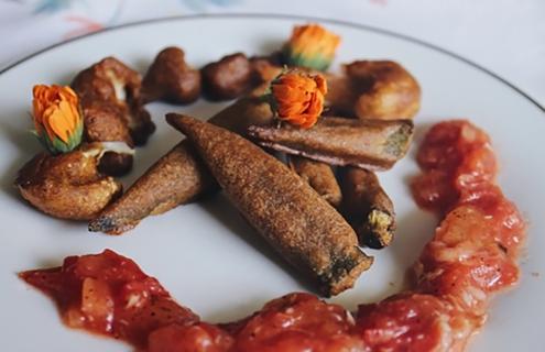 Fried okra is an essential Southern tradition, and this spin on fried okra cuts back on the fat content. This recipe produces crispy, crunchy, spicy ‘fried’ okra and cauliflower, as well as a savory and rich dipping sauce.