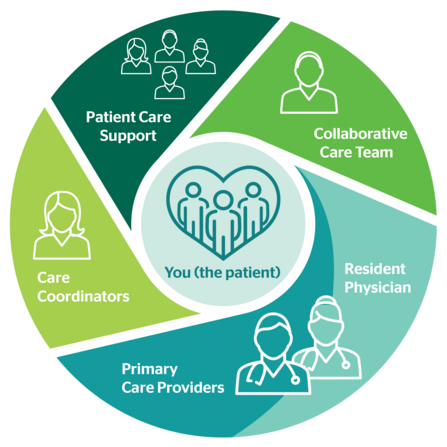 Your team may differ depending on your unique medical needs. For example, a team for someone with a common condition such as high blood pressure or diabetes might include physicians, advanced practice nurses, physician assistants, specialized nurses, pharmacists, nutritionists, collaborative care team, behavioral health specialists, and care coordinators. Under the direction of a PCP, this team works together to meet all the patient’s health care needs.